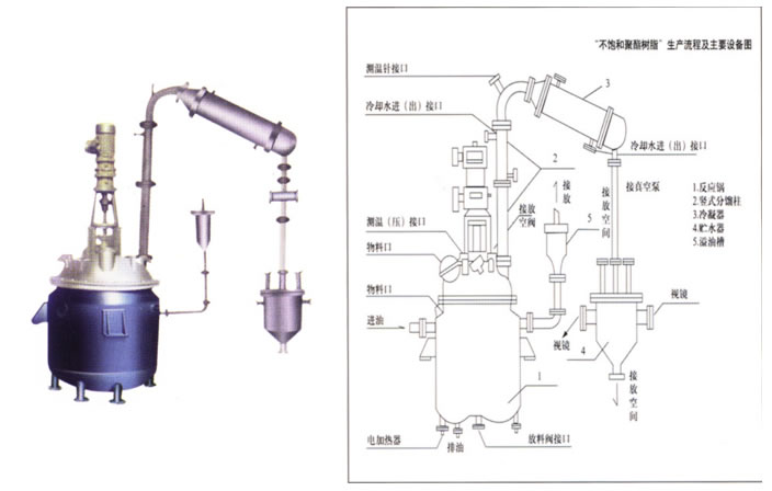 本全套裝置是用于生產(chǎn)不飽和聚脂樹(shù)脂、酚醛樹(shù)脂、環(huán)氧樹(shù)脂、ABS樹(shù)脂、油漆的關(guān)鍵設(shè)備。全套設(shè)備由反應(yīng)鍋、豎式分餾柱、臥式冷凝器、貯水器、溢油槽、管線(對(duì)稀釜)等組成,全套設(shè)備與物料接觸部分的采用不銹鋼制作。