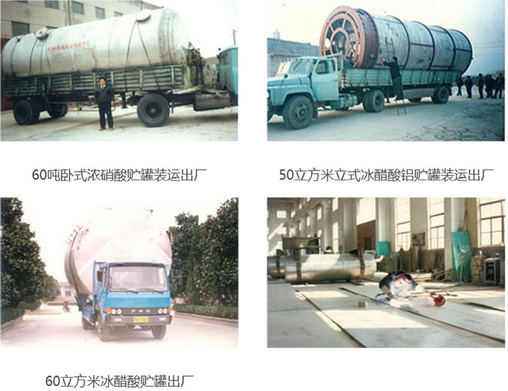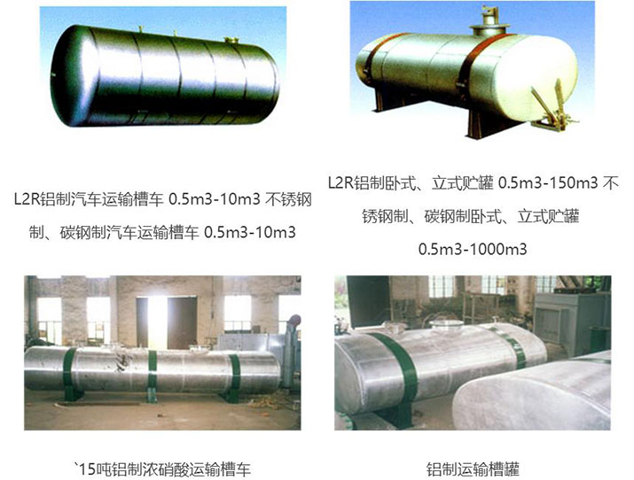 工業(yè)純鋁板制汽車運(yùn)輸槽車、臥式、立式貯罐、高位槽。(主要用于貯運(yùn) 濃硝酸、冰醋酸等腐蝕液體)不銹鋼、碳鋼制各種汽車運(yùn)輸槽車,臥式、 立式貯槽,高位槽計(jì)量槽。特殊規(guī)格可按用戶需求設(shè)計(jì)、制造。